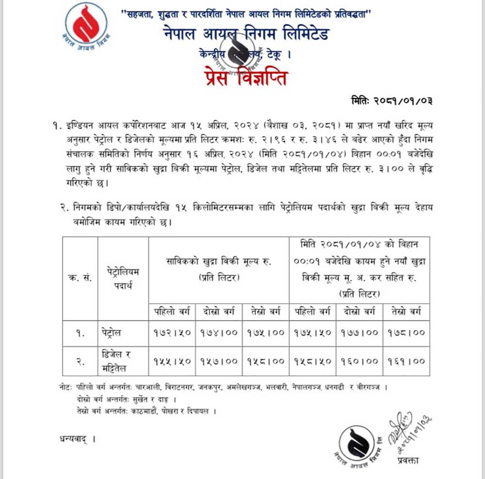 निगमका अनुसार अब काठमाडौं उपत्यकामा पेट्रोलको मूल्य १७८ रुपैयाँ प्रतिलिटर पर्नेछ भने डिजेल र मट्टितेल १६१ रुपैयाँ पर्नेछ ।