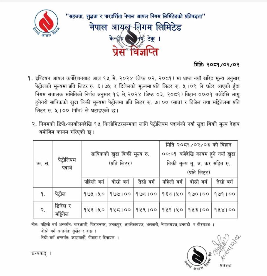 डिजेल र मट्टितेलको मूल्य अधिकतम १५९ रुपैयाँ रहेकोमा त्यो १५४ रुपैयाँमा झरेको छ।