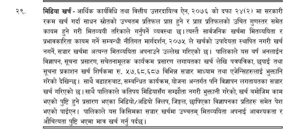 महालेखा परीक्षकको कार्यालयका अनुसार नगरपालिकाले यस वर्ष अनलाइन विज्ञापन, सूचना प्रसारण, सचेतनामूलक कार्यक्रम प्रसारण लगायतका खर्च लेखी पत्रपत्रिका, छपाई तथा सूचना प्रकाशन खर्च शीर्षकमा उक्त रकम भुक्तानी गरेको हो ।
