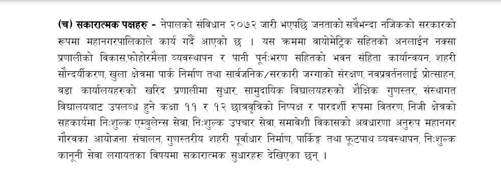 निःशुल्क उपचार सेवा, समावेशी विकासको अवधारणा अनुरूप महानगर गौरवका आयोजना सञ्चालन, गुणस्तरीय शहरी पूर्वाधार निर्माण, पार्किङ तथा फुटपाथ व्यवस्थापन, निःशुल्क कानूनी सेवा लगायतका विषयमा सकारात्मक सुधारहरू देखिएका महालेखा परीक्षकको कार्यालयले बताएको छ ।