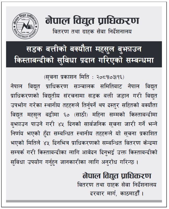 नेपाल विद्युत प्राधिकरणले सडक बत्तीको बक्यौता महसुल बुझाउन किस्ताबन्दीको सुविधा ल्याएको छ । सडक बत्ती बालेबापत लामो समयसम्म शुल्क नबुझाएपछि प्राधिकरणले यस्तो सुविधा ल्याएको हो ।