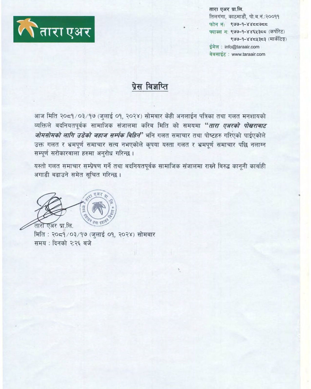 एयरले आफ्नो जहाज सम्पर्कविहीन भएको भन्ने निराधार हल्ला चलाइएको बताएको छ । पोखराबाट जोमसोमका लागि उडेको तारा एयरको जहाज सम्पर्कविहीन भन्ने समाचार मिडिया र सामाजिक सञ्जालमा फैलिएपछि तारा एयरले एक विज्ञप्ति जारी गर्दै कुनै जहाज नहराएको स्पष्ट गरेको छ ।