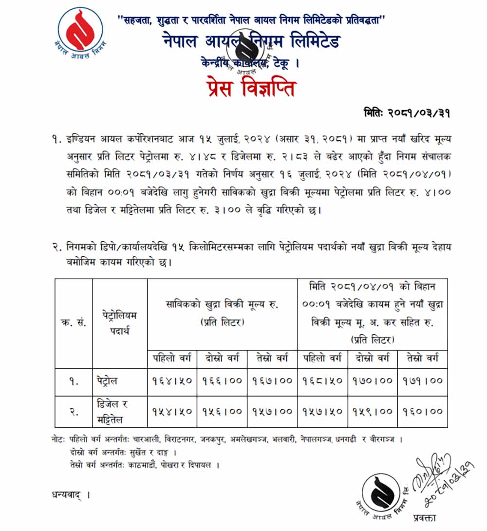 निगमले भारतबाट आएको नयाँ मूल्य सूची बढेर आएकोले मूल्य बढाउनु परेको जानकारी दिएको छ ।