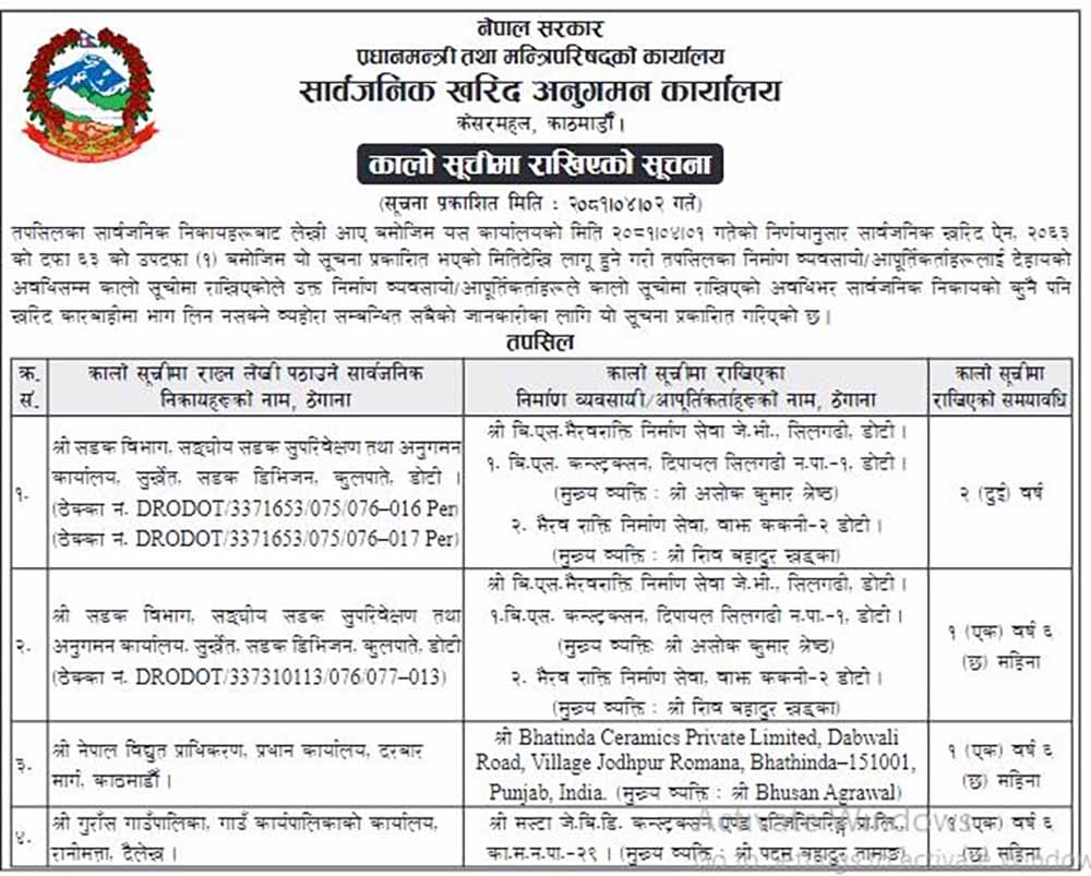 सार्वजनिक खरिद ऐन, २०६३ को दफा ६३ को उपदफा ९१० बमोजिम आजको मितिबाट लागू हुनेगरी ती व्यवसायी तथा आपूर्तिकर्तालाई कालोसूचीमा राखिएको कार्यालयले जनाएको छ ।