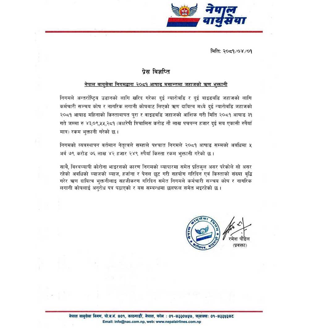 निगमका प्रवक्ता रमेश पौडेलका अनुसार दुई न्यारोबडी जहाजको असार महिनाको किस्तावापत पूरा र वाइडबडी जहाजको आंशिकगरी असार मसान्तसम्मको रकम भुक्तानी गरेको हो ।
