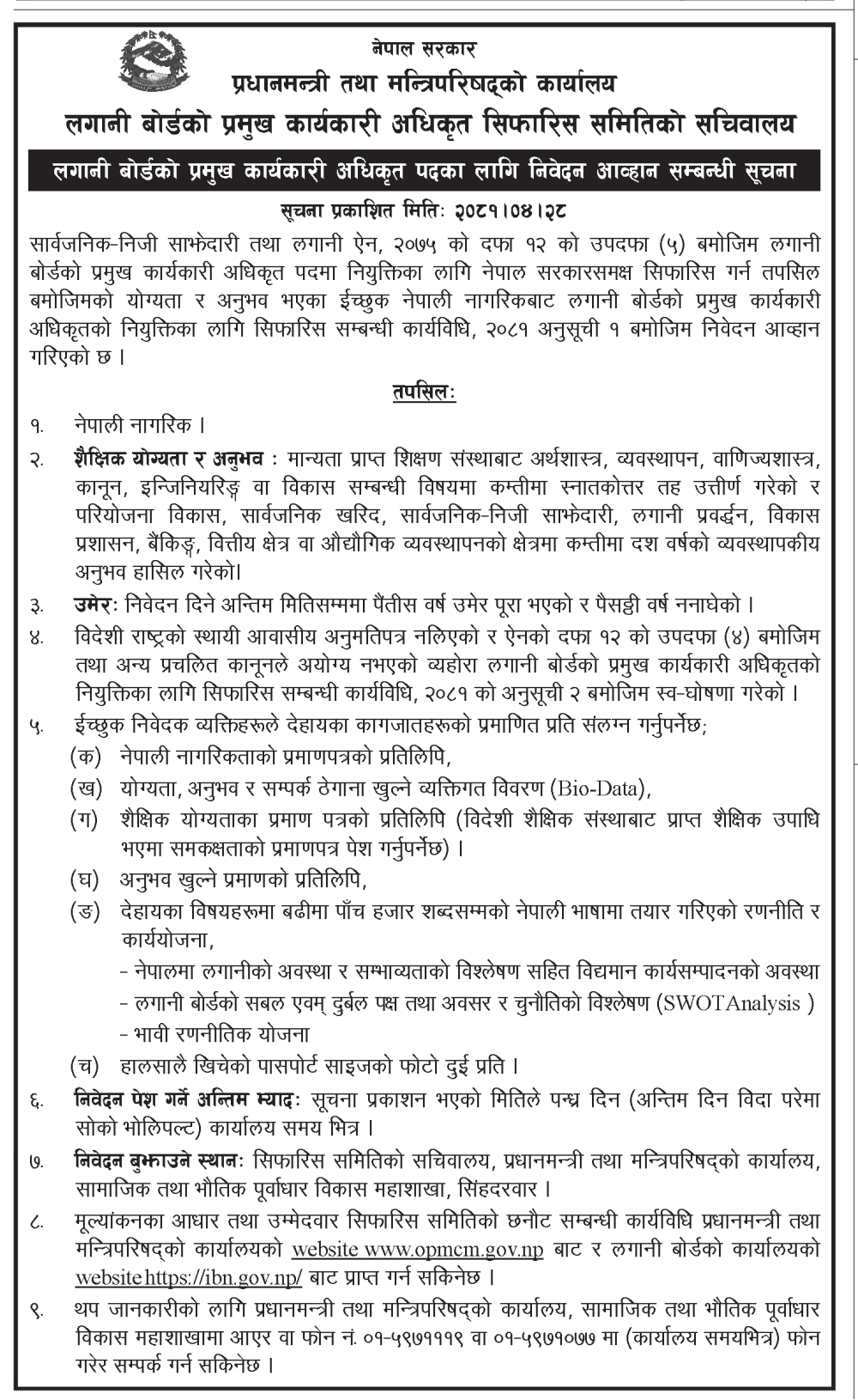 सार्वजनिक(निजी साझेदारी तथा लगानी ऐन, २०७५ को दफा १२ को उपदफा ९५० बमोजिम लगानी बोर्डको प्रमुख कार्यकारी अधिकृत पदमा नियुक्तिका लागि निवेदन आह्वान गरिएको हो । प्रमुख कार्यकारी अधिकृत पदका लागि नेपाली नागरिक भएको हुनुपर्छ । शैक्षिक योग्यता भने मान्यता प्राप्त शिक्षण संस्थाबाट अर्थशास्त्र, व्यवस्थापन, वाणिज्यशास्त्र, कानुन, इन्जिनियरिङ वा विकाससम्बन्धी विषयमा कम्तीमा स्नातकोत्तर तह उत्तीर्ण गरेको हुनुपर्छ ।