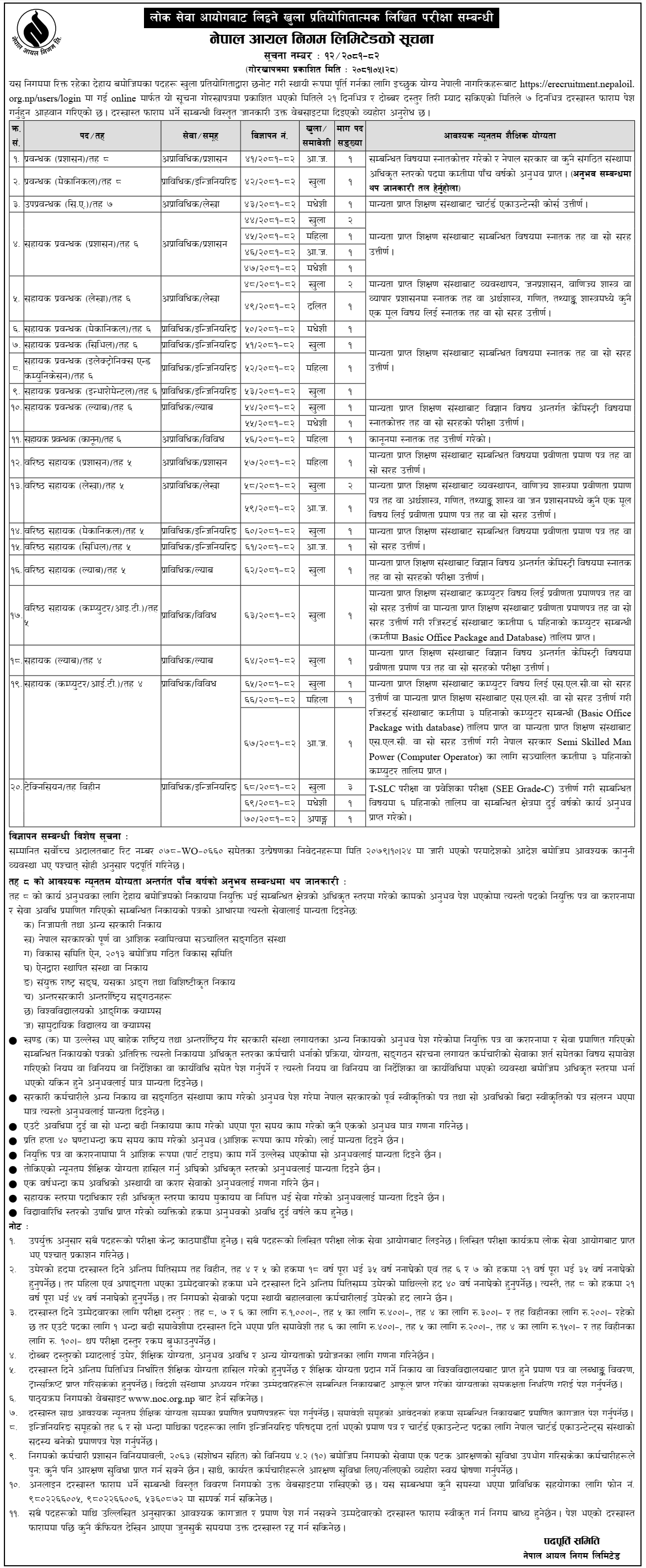 नेपाल आयल निगमले विभिन्न पदामा सरकारी जागिरको लागि अवसर खुलाएको छ । शुक्रबार एक सार्वजनिक सूचनासहित निगमले प्राविधिक र अप्राविधिक गरी ३ दर्जनभन्दा बढी कर्मचारीको लागि आवेदन आह्वान गरेको हो ।