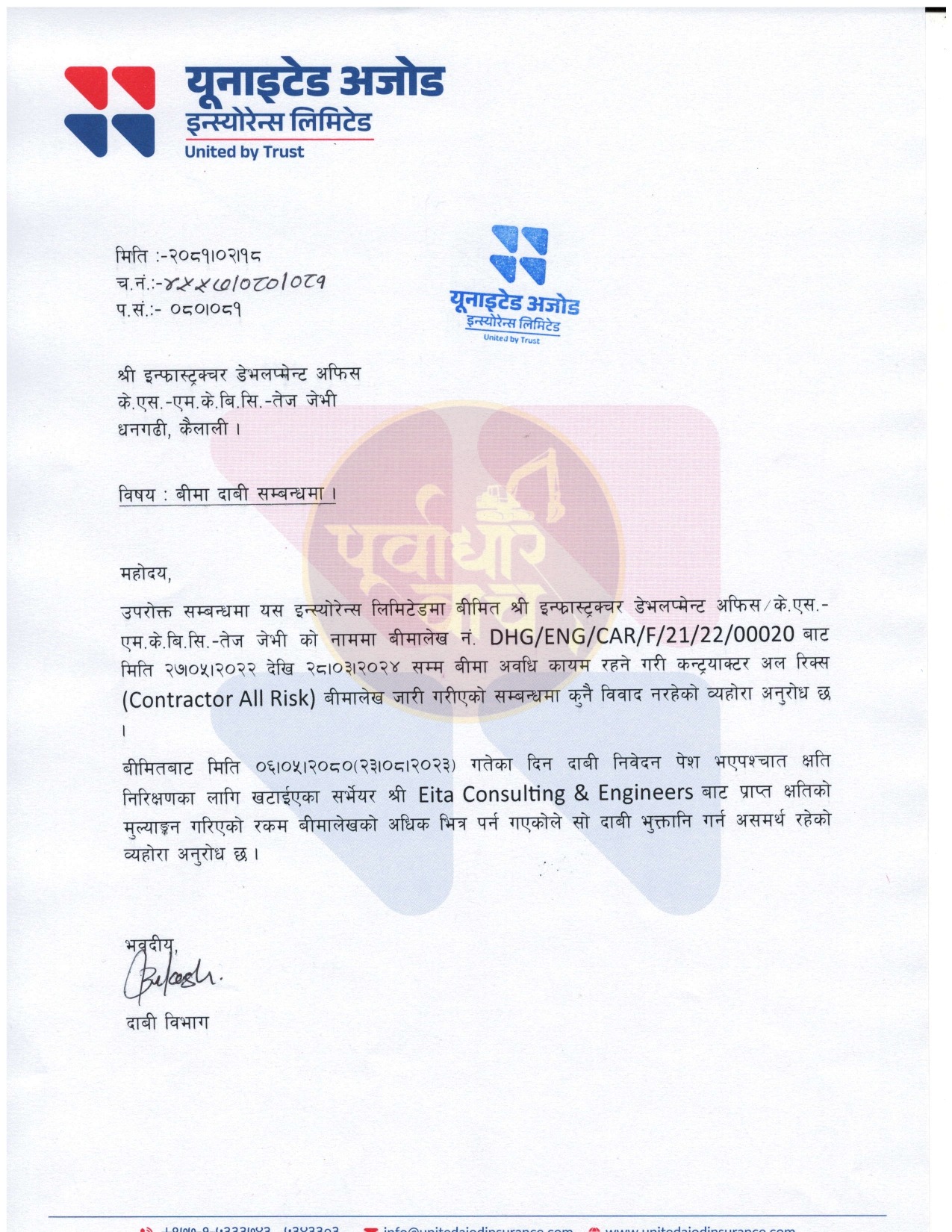 यतिसम्म आइपुग्दा उक्त ठेक्काका बीमक र बीमितबीच कुनै विवाद देखिएको थिएन । निर्माण कार्यमा संलग्न जेभीले क्षतिको भुक्तानी दाबी गरेपछि यूनाइटेड अजोड इन्स्योरेन्सले संरचनामा भएको क्षतिको मूल्यांकन गर्न आइटा कन्सल्टिङ एण्ड इन्जिनियरियर्स (EITA Consulting & Engineers)लाई सर्भेयर नियुक्त गर्याे ।