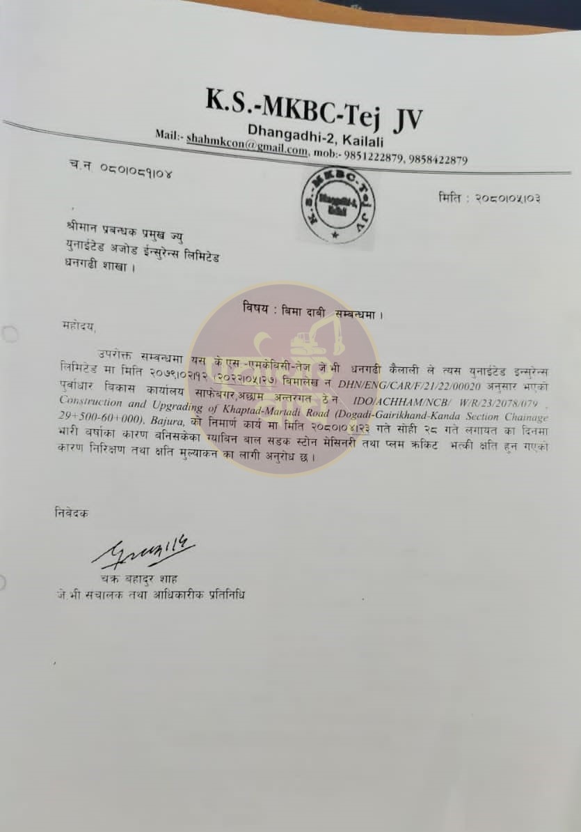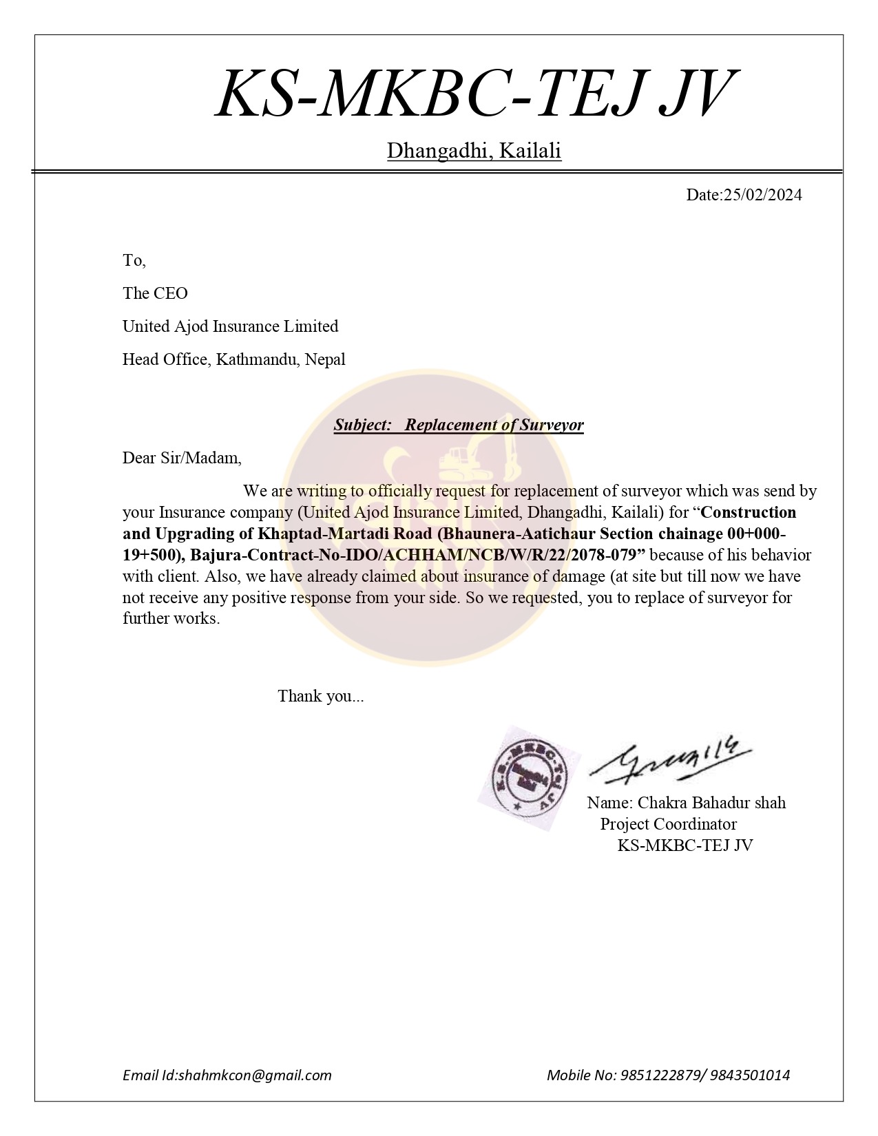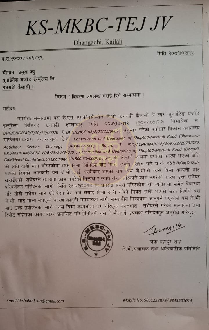 सर्भेयरको निर्देशनबमोजिम खुरुखुरु काम गरिसकेपछि निर्माण व्यवसायीलाई यूनाइटेड अजोड इन्स्योरेन्सले बीमाको दाबी भुक्तानी दिन नसकिने भन्दै पत्र पठाएपछि आफूहरु चकित भएकाे शाह बताउँछन् ।