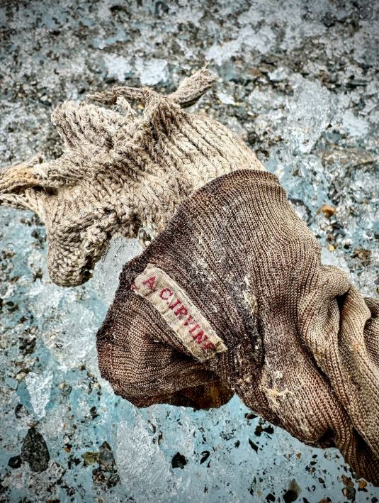 आधासम्म पग्लेको हिउँको सतहबाट बाहिर निस्किएको एउटा जुत्ता र त्यसमा घुसाइएको खुट्टाको अवशेषमा लगाइएको मोजा पनि फेला परेको छ, जसमा एम्ब्रोइडरीले लेखिएको छ- ए. सी. इरविन।