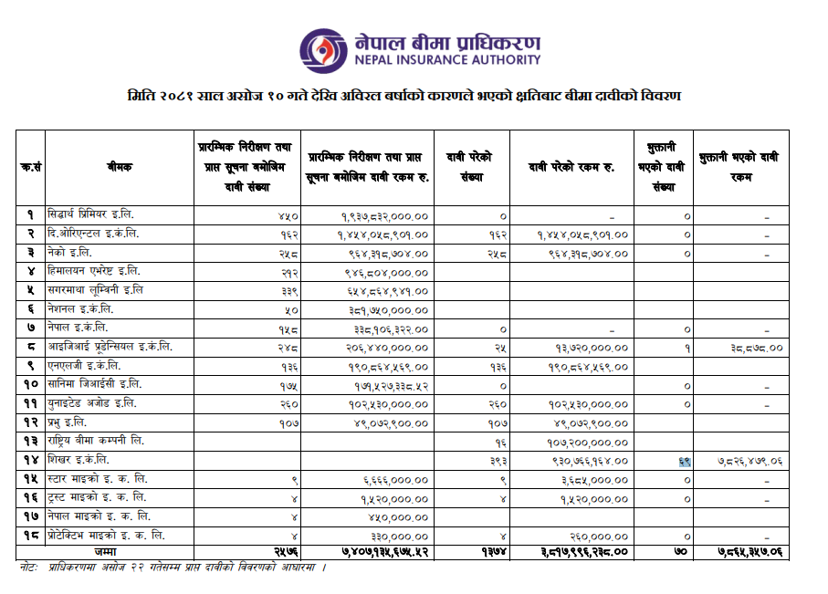 असोज दोस्रो साता गएको बाढीपहिरोका कारण साढे सात अर्बको बिमा दाबी रकम पर्ने प्रारम्भिक अनुमान गरिएको छ । असोज १० देखि २२ गतेसम्म तीन अर्ब ८१ करोड ७९ लाख रुपैयाँ दाबी परेको नेपाल बिमा प्राधिकरणले जनाएको छ ।
