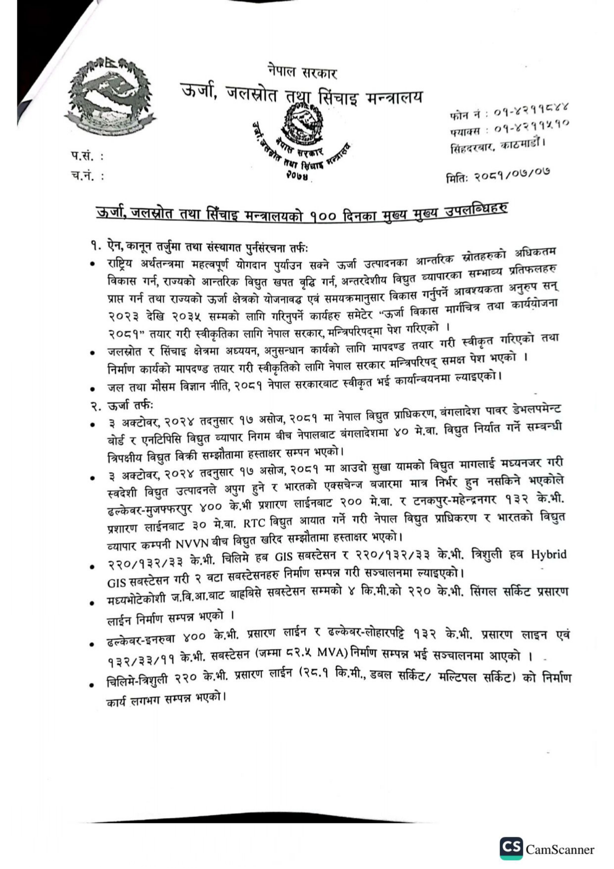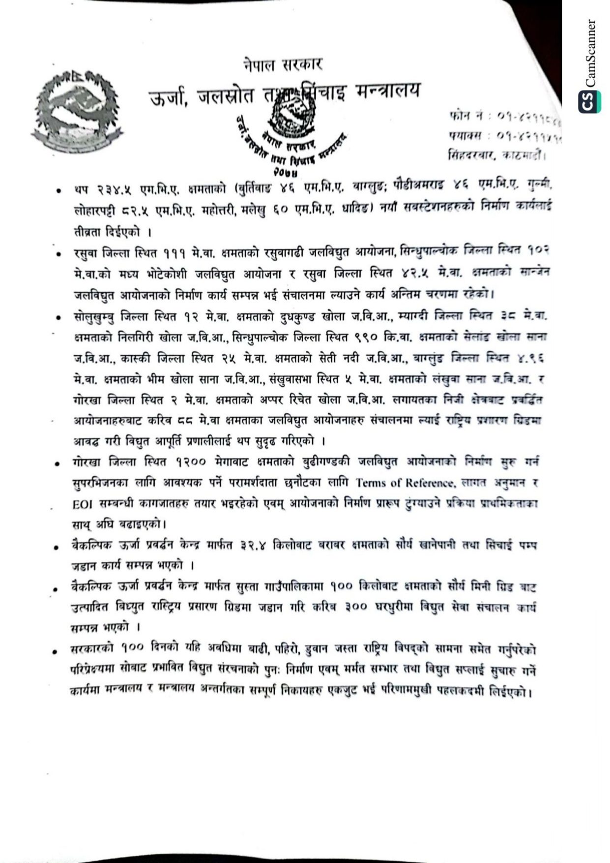 सरकारको १०० दिनको यहि अवधिमा बाढी, पहिरो, डुवान जस्ता राष्ट्रिय विपद्को सामना समेत गर्नुपरेको परिप्रेक्ष्यमा सोबाट प्रभावित विद्युत संरचनाको पुनः निर्माण एवम् मर्मत सम्भार तथा विद्युत सप्लाई सुचारु गर्ने कार्यमा मन्त्रालय र मन्त्रालय अन्तर्गतका सम्पूर्ण निकायहरु एकजुट भई परिणाममुखी पहलकदमी लिईएको पनि उपलब्धीमा गनेका छन् ।