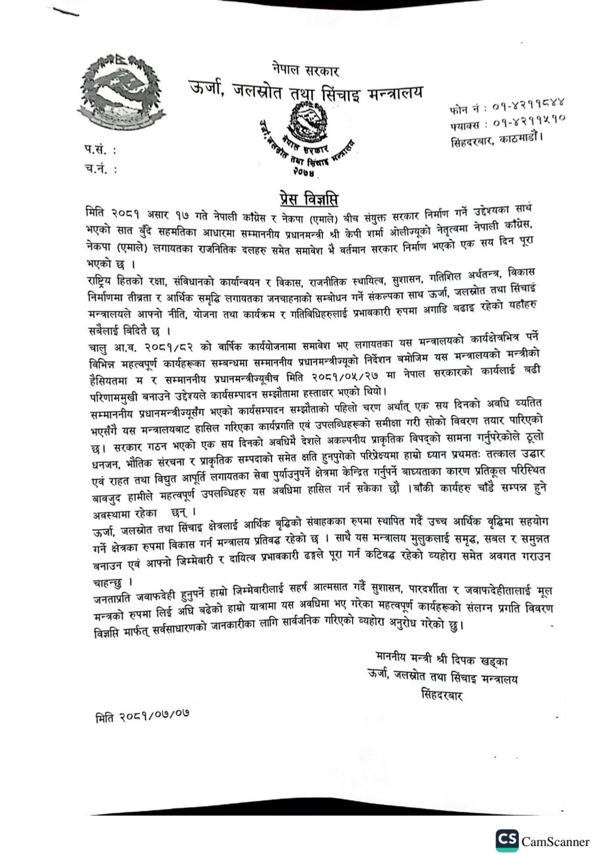 ऊर्जा, जलश्रोत तथा सिञ्चाई मन्त्री दीपक खड्काले १०० दिने प्रगति विवरण सार्वजनिक गरेका छन् । मन्त्री खड्काले बुधबार आफ्नो सय दिने प्रगति विवरण सार्वजनिक गरेका हुन् ।