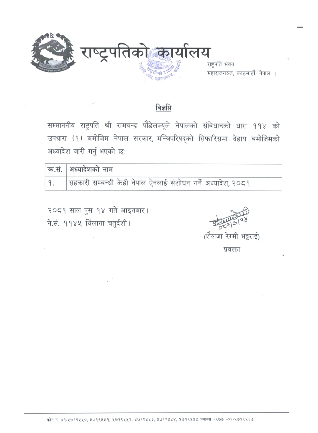 नेपालको संविधानको धारा ११४ को उपधारा १ बमोजिम राष्ट्रपति पौडेलले उक्त अध्यादेश स्वीकृत गरेका हुन्।