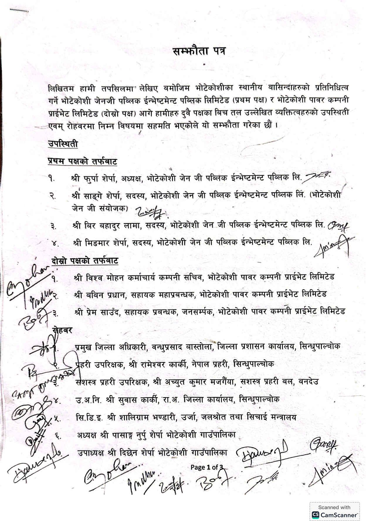 सम्झौता पत्रमा जेनजी पब्लिक इन्भेष्टमेन्ट पब्लिक लिमिटेडका अध्यक्ष फुर्पा शेर्पा र भोटेकोशी कम्पनीका तर्फबाट सचिव विश्वमोहन कर्माचार्य लगायतले हस्ताक्षर गरेका छन् ।