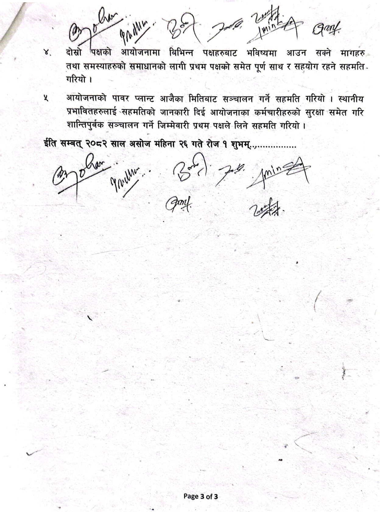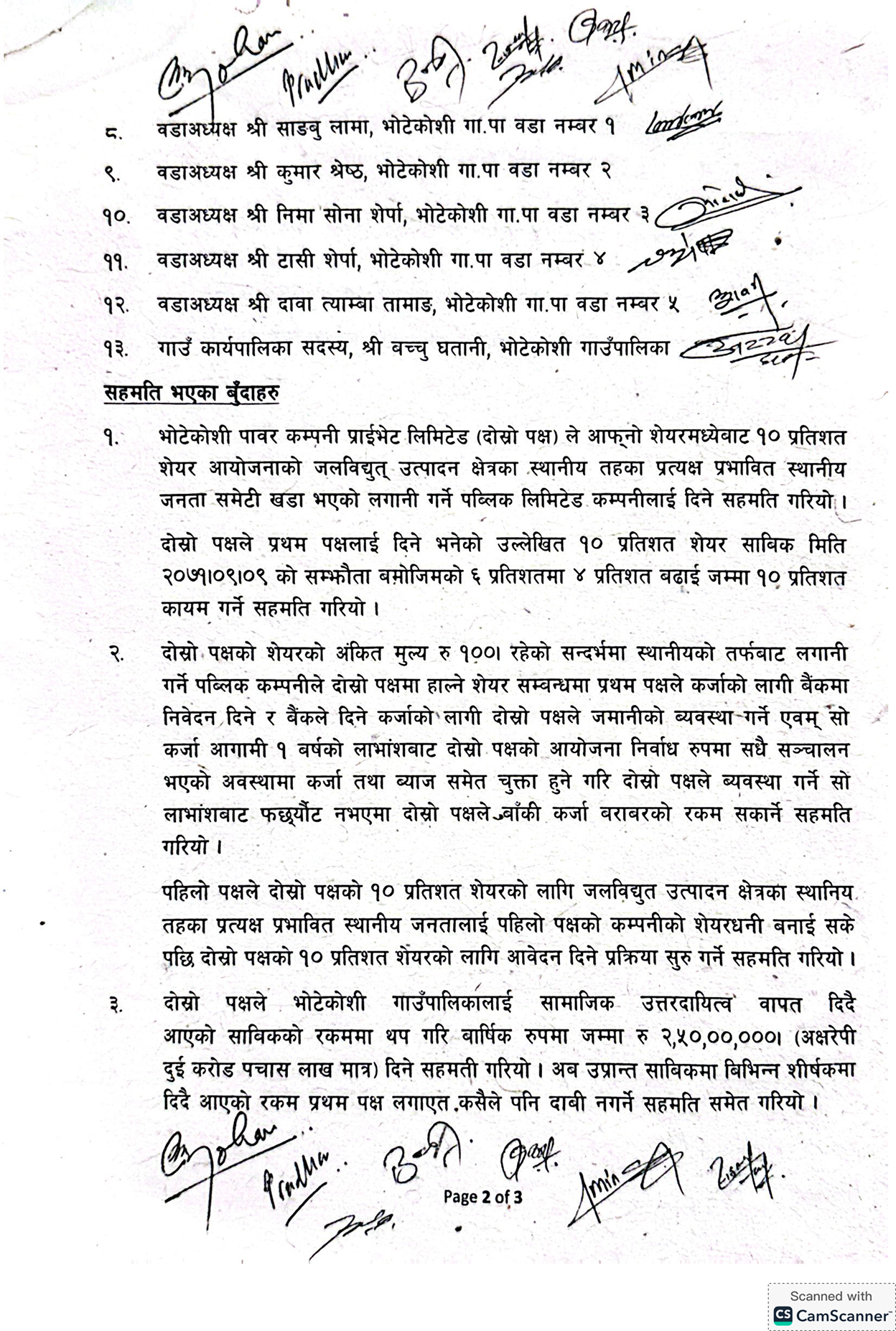 ‘भोटेकोशी पावर कम्पनी प्राइभेट लिमिटेड (दोस्रो पक्ष)ले आफ्नो शेयरमध्येबाट १० प्रतिशत शेयर आयोजनाको जलविद्युत् उत्पादन क्षेत्रका स्थानीय तहका प्रत्यक्ष प्रभावित स्थानीय जनता समेटी खडा भएको लगानी गर्ने पब्लिक लिमिटेड कम्पनीलाई दिने सहमति गरियो,’ सम्झौता पत्रमा भनिएको छ, ‘दोस्रो पक्षले प्रथम पक्षलाई दिने भनेको उल्लेखित १० प्रतिशत शेयर साबिक २०७१/०९/०९ को सम्झौता बमोजिमको ६ प्रतिशतमा ४ प्रतिशत बढाई जम्मा १० प्रतिशत कायम गर्ने सहमति गरियो ।’