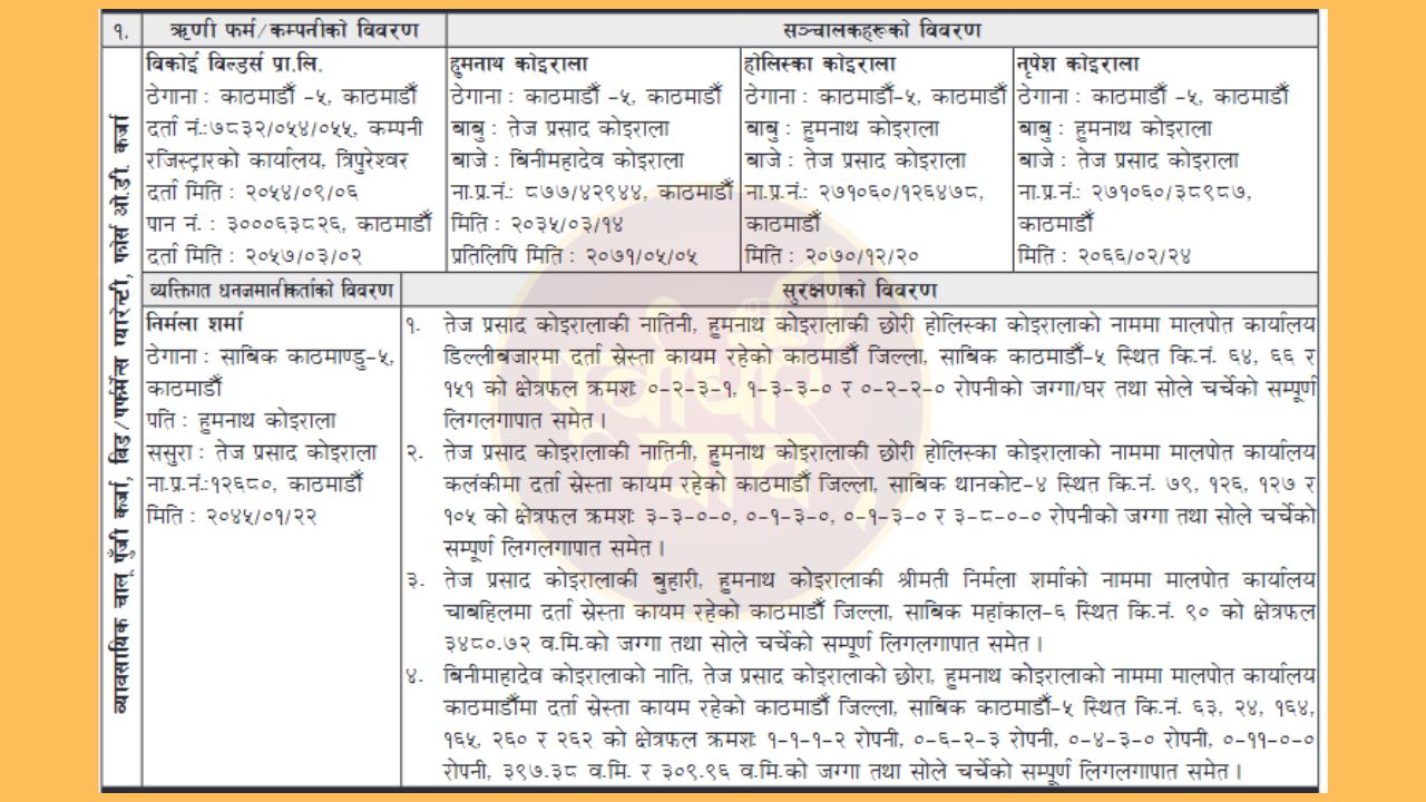 बैंकको ब्याज नतिरेपछि विकोइ बिल्डर्सका सञ्चालक ठेकेदार हुमनाथ कोइराला, उनकी छोरी होलिस्का कोइराला र श्रीमती निर्मला शर्माको नामको रहेको काठमाडौंका विभिन्न स्थानमा अवस्थित घरजग्गा लिलामी हुने भएको छ ।