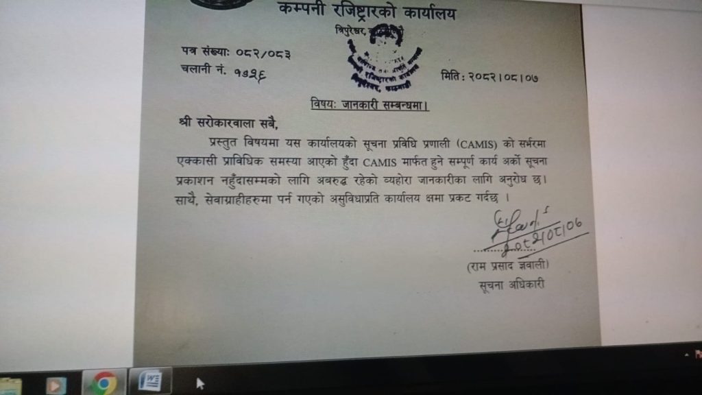 कार्यालयको सूचना प्रविधि प्रणाली (क्यामिस) को सर्भरमा एक्कासी प्राविधिक समस्या आएको भन्दै कार्यालयले अनलाइनमार्फत हुँदै आएको सेवा प्रवाह कम्पनी दर्ता, अद्यावधिक गर्नेदेखि कम्पनी खारेजीसम्मका सबै काम अवरुद्ध भएको जानकारी दिएको छ ।