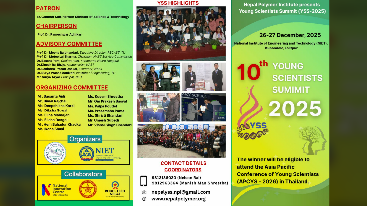 नेपाल पोलिमर इन्स्टिच्युट (NPI) र नेशनल इन्स्टिट्युट अफ इन्जिनियरिङ एण्ड टेक्नोलोजीले युवा वैज्ञानिक शिखर सम्मेलन (YSS–2025) को दशौं संस्करण ललितपुरको कुपन्डोलस्थित नेशनल इन्स्टिच्यूट अफ इन्जिनियरिङ एण्ड टेक्नोलोजीमा गर्ने घोषणा गरेका छन्।