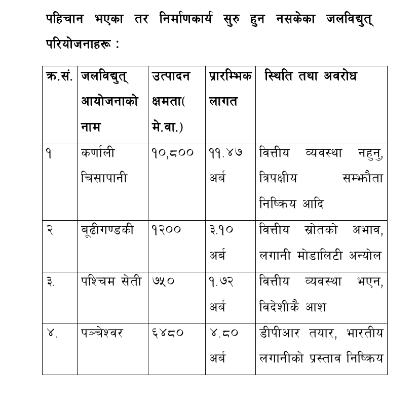 पहिचान भएका तर निर्माणकार्य सुरु हुन नसकेका जलविद्युत् परियोजनाहरू
