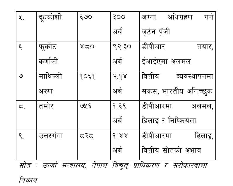 अर्कोतिर, आन्तरिक स्रोत परिचालन गर्दै कतिपय जलविद्युत् आयोजनाहरू निर्माणमा लैजान सकिने खालका थिए । बूढीगण्डकी, दूधकोशी, माथिल्लो अरुण, तमोर र उत्तरगंगाजस्ता महत्वपूर्ण ठूला तथा जलाशययुक्त जलविद्युत् आयोजनाहरू स्वदेशी पुँजीमा बनाउने भने पनि अहिलेसम्म प्रगति भइरहेको छैन ।