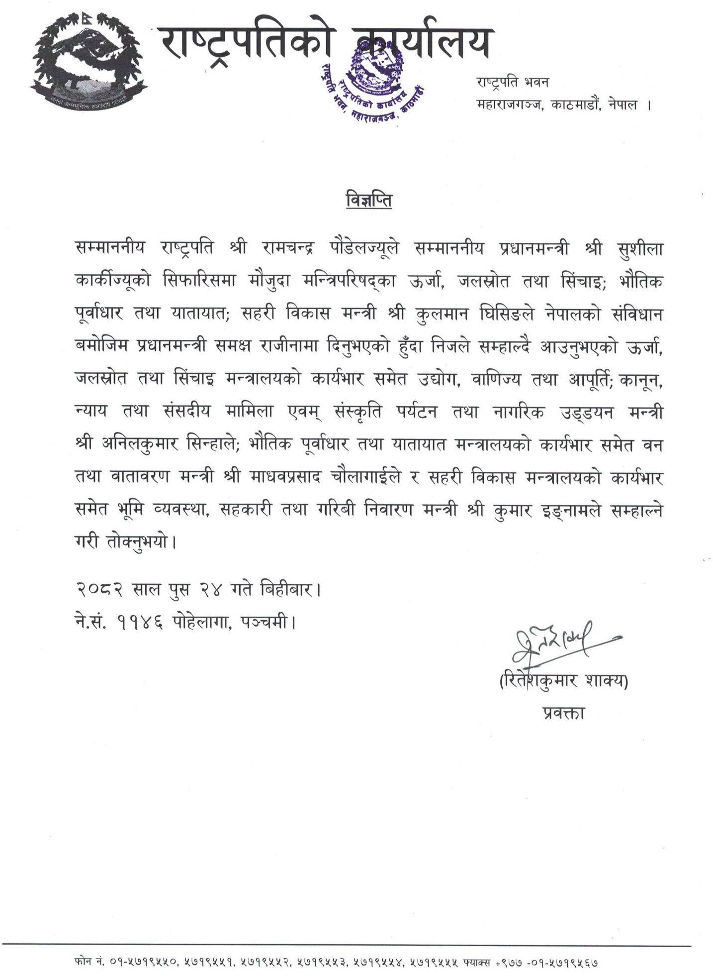 घिसिङको राजीनामा लगत्तै रिक्त भएका मन्त्रालयमा प्रधानमन्त्री सुशीला कार्कीले अन्य मन्त्रालयको जिम्मेवारी सम्हालिरहेका मन्त्रीलाई थप जिम्मेवारी दिएकी छन् ।
