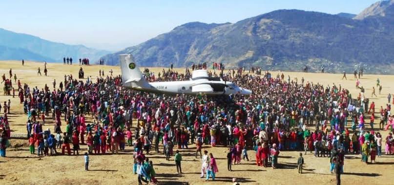 फोटोः २०८० फागुन १२ गते सफल परिक्षण उडानमा तत्कालिन उपप्रधानमन्त्री पुर्णबहादुर खड्का र पर्यटन मन्त्री सुदन किराँतीसहितका नेताहरु । ४ दशकदेखि निर्णाणाधिन सुनथराली विमानस्थलमा उपस्थित स्थानीयहरु । यो विमानस्थल दुई पटक परिक्षण उडान गरिए पनि नियमित सञ्चालनमा आउन सकेको छैन ।