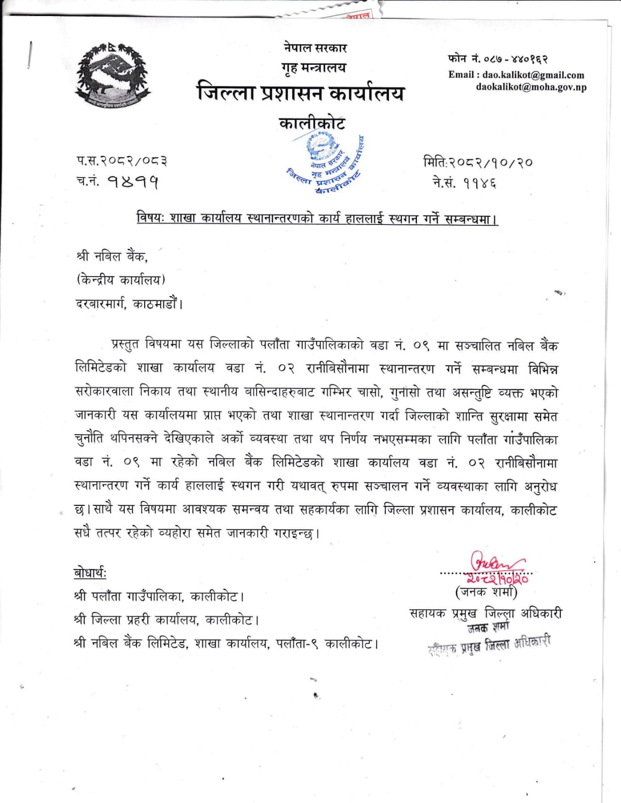 जिल्ला प्रशासन कार्यालयले पालिकासँग समन्वय नगरि एकतर्फिरुपमा सुरक्षा संवेदनशीलताको कारण देखाउँदै शाखा सार्न नसकिने पत्र जारी गर्नु स्थानीय सरकार सञ्चालन ऐन २०७४ को बर्खिलापमा गएको रोकायाको दाबी छ । बैंक शाखा सञ्चालको सहजिकरण तथा नागरिकको सहज सेवाका लागि बैंकलाई स्थायी केन्द्रमा सार्न ८ महिनादेखि पहल गरिरहेको बताउँदै रोकायाले भने,‘नविल बैंकको शाखादेखि केन्द्रीय कार्यलयसम्म पनि पटक– पटक धाउँदासमेत बैंकले उदाशिनता देखाउनु निकै दुःखद विषय हो ।’
