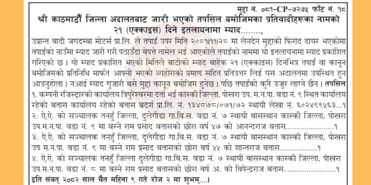जगदम्बा मोटर्स प्रा.लि. र बतास ब्रदर्श प्रा.लि.बीचको लेनदेन विवाद चर्किंदै जाँदा काठमाडौं जिल्ला अदालतले प्रतिवादी पक्षलाई २१ दिनभित्र उपस्थित हुन कडा निर्देशन दिएको छ।