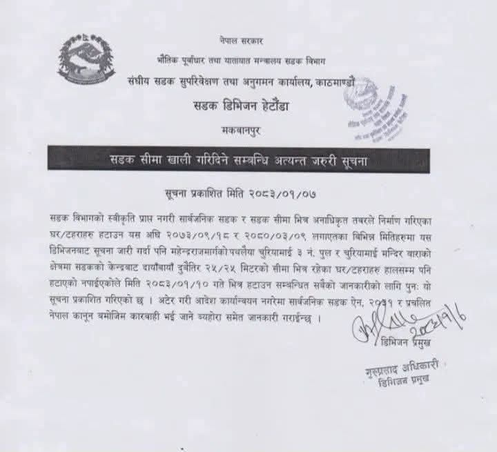यसअघि पनि २०७३/०९/१८ र २०८०/०३/०९ लगायतका विभिन्न मितिहरूमा सूचना जारी गर्दा समेत संरचनाहरू नहटाएपछि डिभिजनले पुनः यो ताकेता गरेको हो ।
