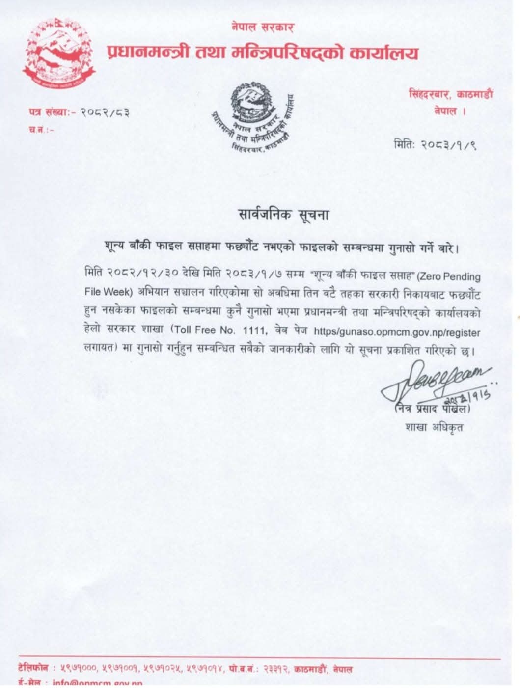 प्रधानमन्त्री तथा मन्त्रिपरिषद्को कार्यालयले बुधबार एक सूचना जारी गदै ‘शून्य बाँकी फाइल सप्ताह’ अभियानका क्रममा फछ्यौट हुन नसकेका फाइलबारे गुनासो गर्न सर्वसाधारणलाई आह्वान गरेको हो ।