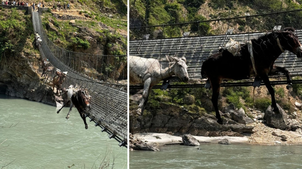 कर्णालीको झोलुंगे पुलको लठ्ठा चुँडिदा १४ वटा खच्चड अड्किए